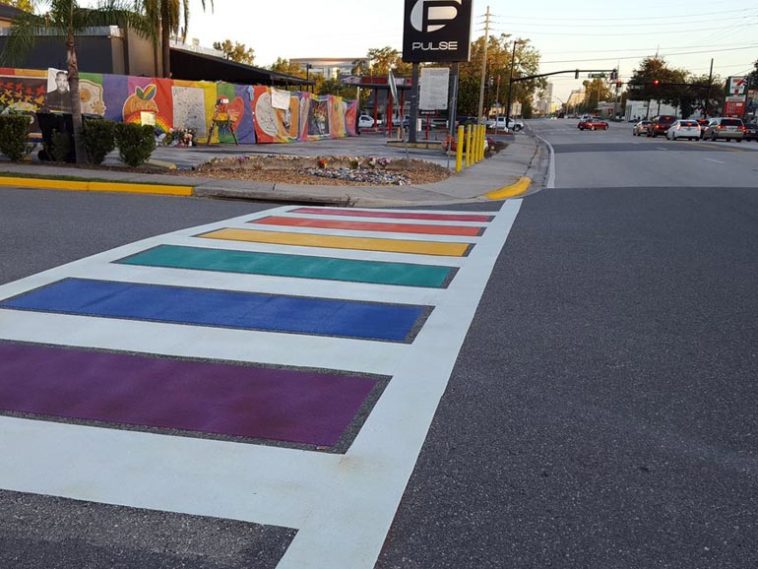Die Stadt Orlando errichtete in Erinnerung an die Opfer der Schiesserei im Nachtclub «Pulse» vor mehr als einem Jahr einen Regenbogenfussgängerstreifen. Am 9. Oktober wurde das Projekt in die Wege geleitet – drei Tage später ersetzte ein farbiger Strassenübergang für Fussgänger den mittlerweile verblassten Fussgängerstreifen zwischen der West Esther Street und der Orange Avenue.