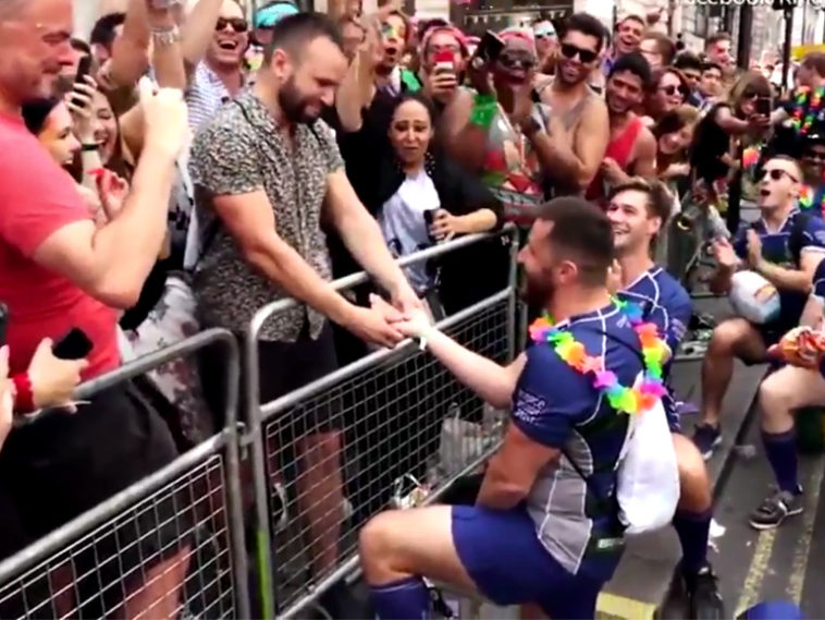 Die Kings Cross Steelers nehmen seit Jahren am Umzug der London Pride teil. Auch letztes Wochenende marschierten die Teilnehmer der Rugbymannschaft durch die Strassen der britischen Hauptstadt. Dieses Jahr gabs für die Zuschauenden aber mehr als nur Ballwürfe. Der Spieler Fernando Ferreira brach aus der Formation aus und ging vor seinem Freund Greg Woodford, der den Umzug am Strassenrand beiwohnte, auf die Knie.