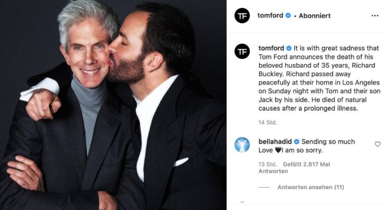 Buckley sei zu Hause «nach längerer Krankheit eines natürlichen Todes» gestorben, so das offizielle Statement eines Ford-Sprechers. In der Erklärung heisst es weiter: «Mit grosser Trauer gibt Tom Ford den Tod seines geliebten Ehemanns Richard Buckley bekannt, den er 35 Jahre lang geliebt hat. Richard ist letzte Nacht friedlich in ihrem Haus in Los Angeles eingeschlafen, mit Tom und ihrem Sohn Jack an seiner Seite.»